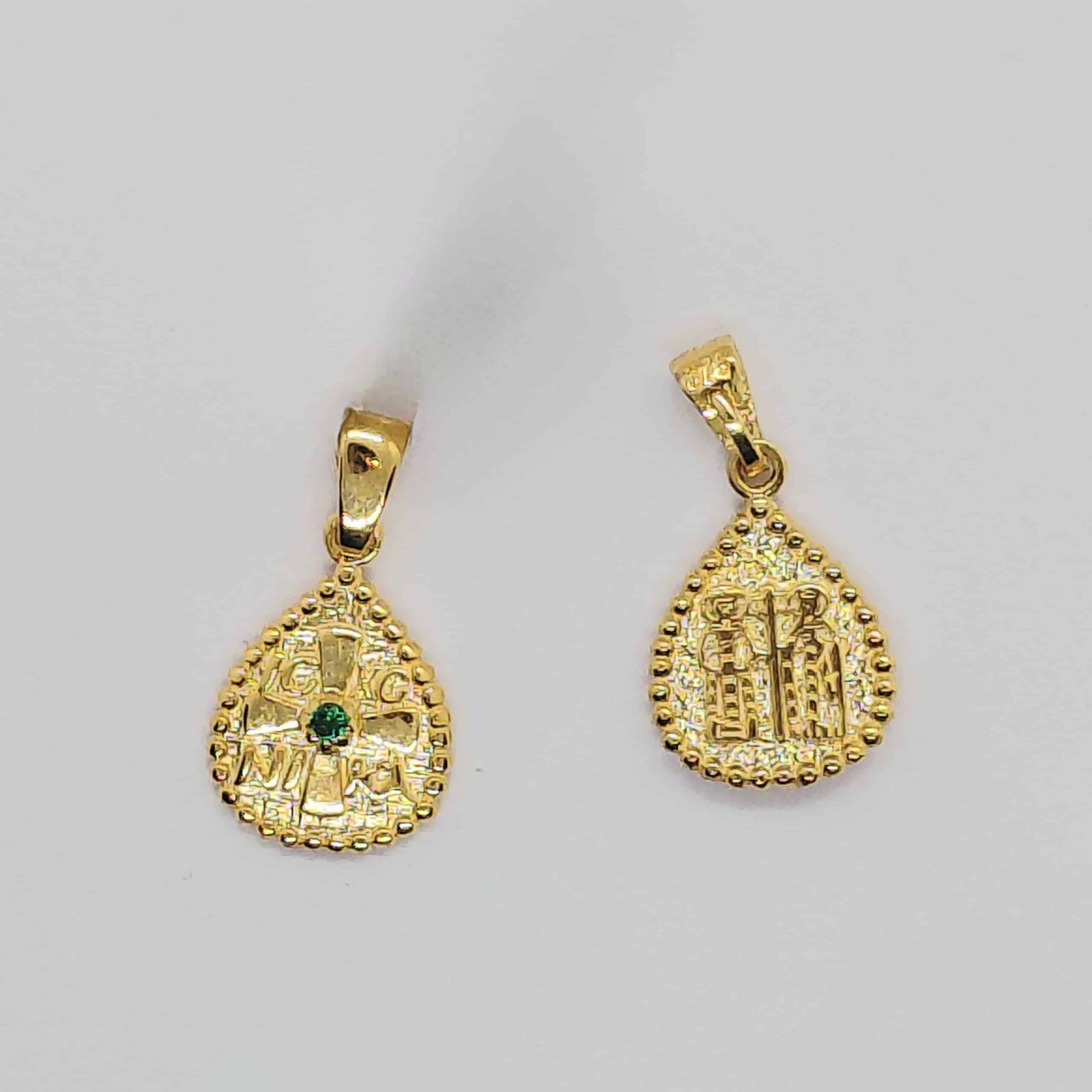 Ένα πολύ όμορφο κωνσταντινάτο από καθαρό χρυσό 9 καρατίων σε σχήμα σταγόνας με δυο όψεις και ημιπολύτιμη πέτρα ζιργκόν πράσινου χρώματος στο κέντρο. Ιδανικό δώρο για νεογέννητα!